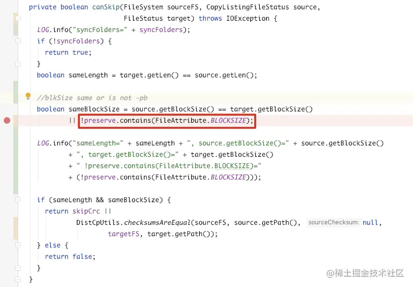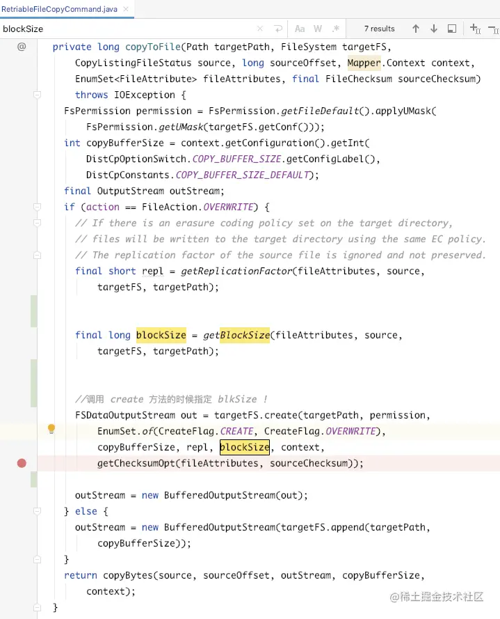 (1)target 目录不存在的情况,即第一次 distcp,会调用 create 方法创建文件,此时会指定 blockSize