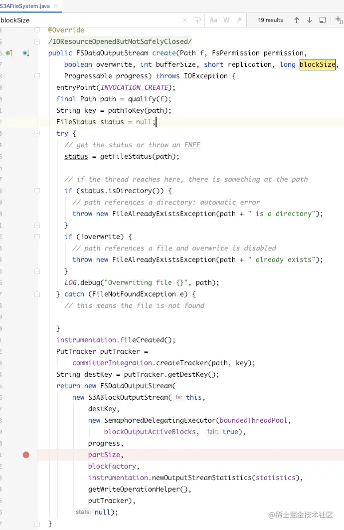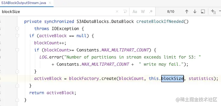 上图最后会创建一个 S3ABlockOutputStream对象,传入了一个 partSize,看参数意思是该值作为 blockSize