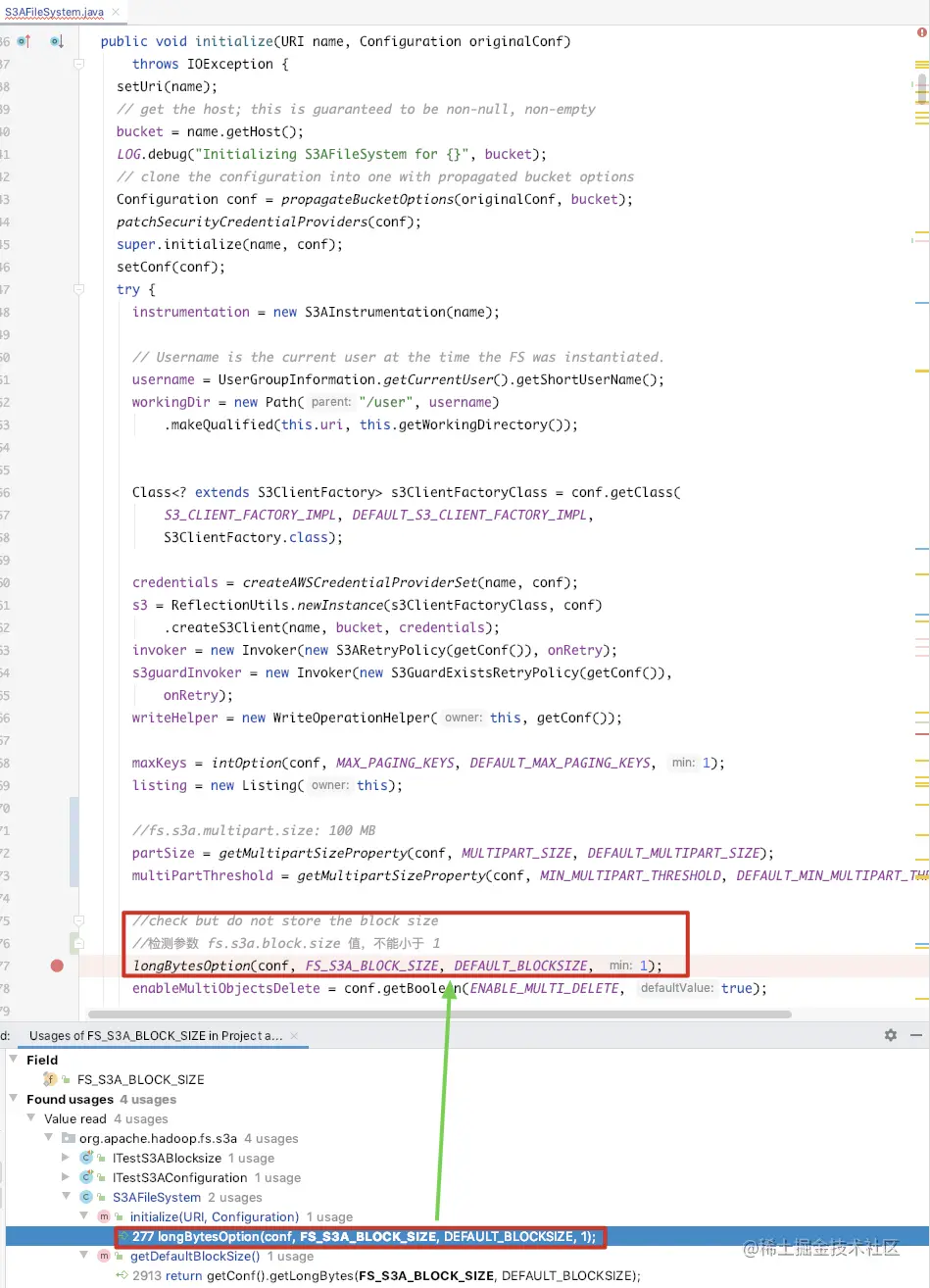 查看 FS_S3A_BLOCK_SIZE 的调用,只有 getDefaultBlockSize 和 initialize(只做参数值检测) 使用到了。
