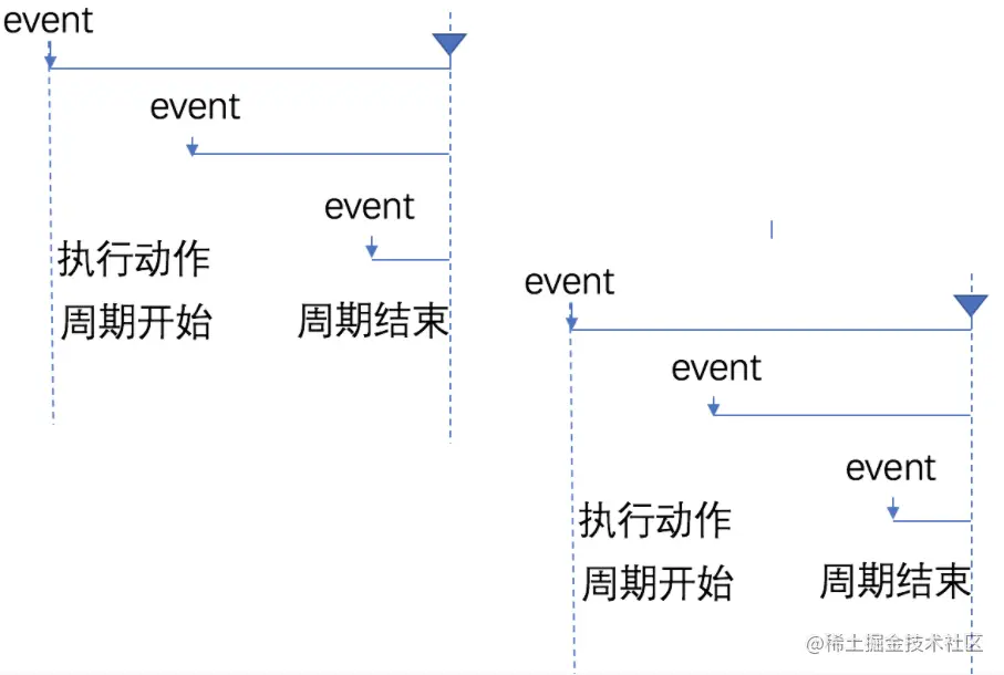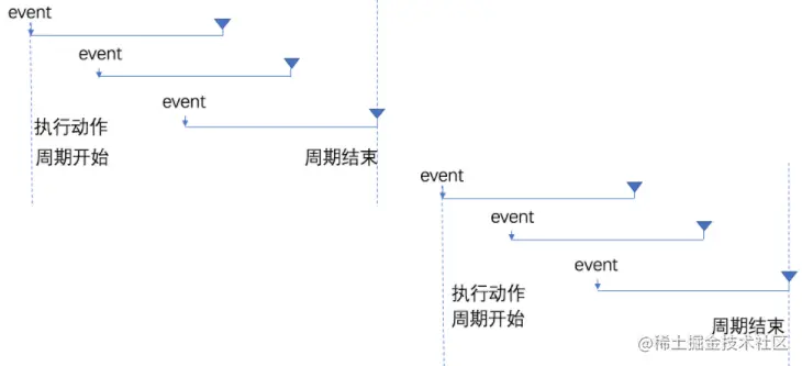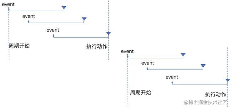 版本2: 周期内有新事件触发,记录最近触发时间,当前周期结束后判断当前周期内是否有触发,如有则设置延时器,以此类推,直到周期结束后判断当前周期内没有触发则执行动作。(此版本不会清除定时器)