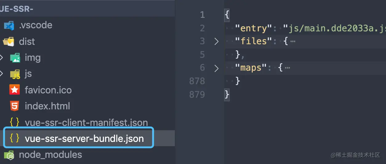 通过传入的 bundle 文件读取该文件的 entry、files、maps 信息。来看下 vue-ssr-server-bundle.json 文件的结构