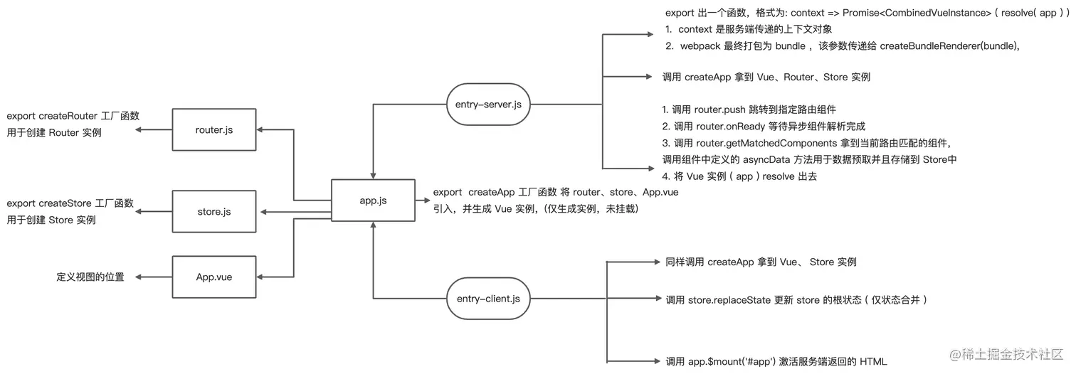 了解了整体的构建流程以后,我们来看下公共部分 app.js 实现以及 entry-client.js 和 entry-server.js 的内部逻辑。