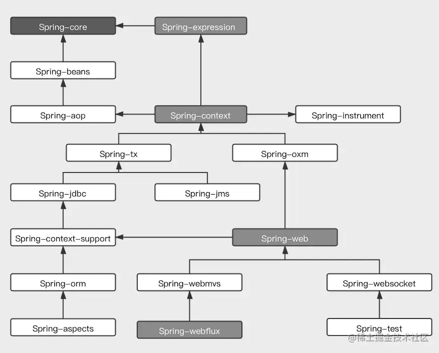 核心容器由spring-beans、spring-core、spring-context 和spring-expression(Spring Expression Language, SpEL) 4 个模块组成。