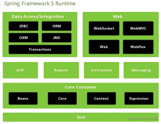 Spring 总共大约有 20 个模块,由 1300 多个不同的文件构成。而这些组件被分别整合在核心容器(Core Container)、AOP(Aspect Oriented Programming)和设备支持(Instrmentation)、数据访问及集成(Data Access/Integeration)、Web、报文发送(Messaging)、Test,6 个模块集合中。以下是 Spring 5 的模块结构图。