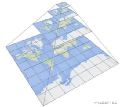 - 某一瓦片等级地图的瓦片是由低一级的各瓦片切割成4个瓦片组成,形成了瓦片金字塔
