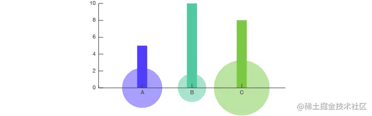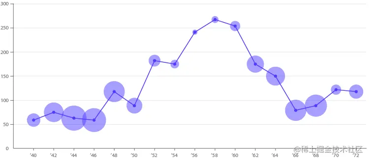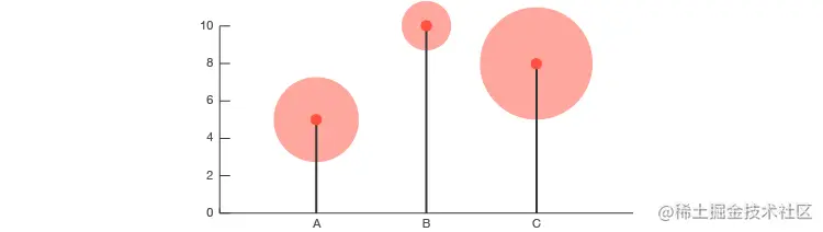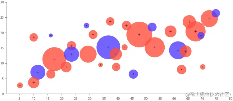 当然,将比例面积图与散点图结合起来会产生众所周知的 气泡图。在此,将点转换为面积与第三变量成比例的大小不同的圆。