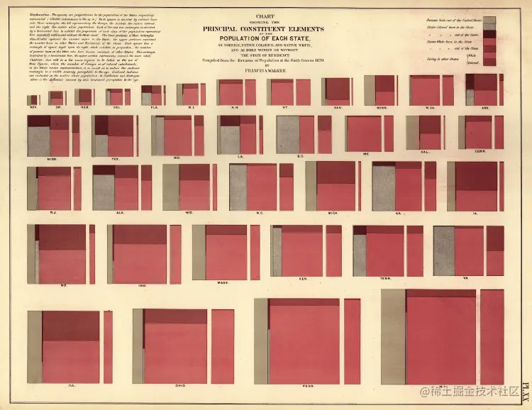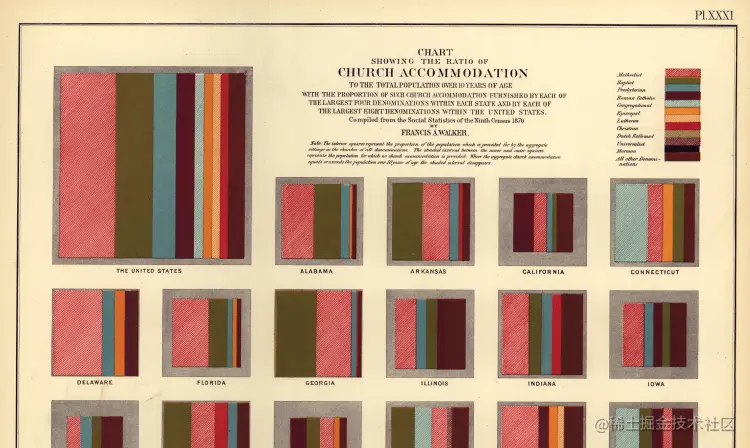 我发现这种风格的比例面积图从一个更早的迭代第九次人口普查(1870)的统计地图集由弗朗西斯·沃尔克。在这里,美国各州的形状区域是根据该人口中每个教会支配的比例来划分的: