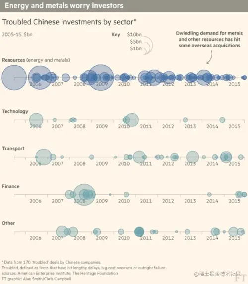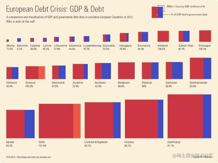 在下面的示例中,每个正方形代表一个国家的GDP,该债务的GDP数量用红色表示。通过将每个正方形分为两个部分,你可以查看到哪些国家负债最多。