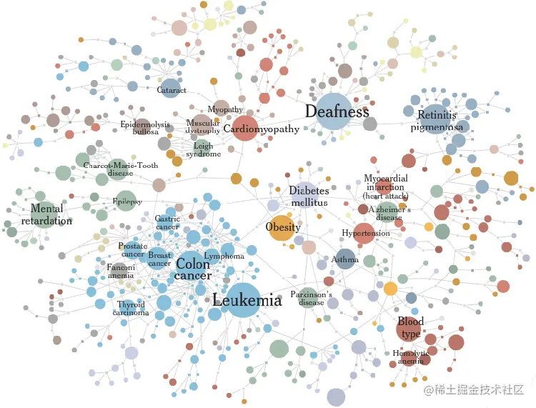 另一个很好的例子来自《纽约时报》,他绘制了许多不同的人类疾病或病症的图谱,并根据与该疾病或病症相关的基因数量成比例地改变了结节的大小。