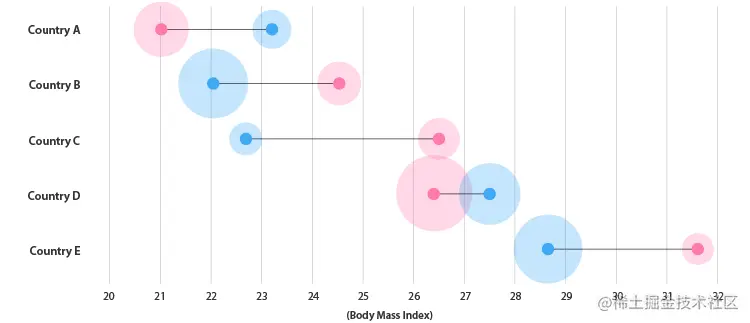 如果你想让图表更多地关注范围数据中的最小值和最大值,那么与哑铃图结合将是一个更好的解决方案。在下面的示例中,有两个变量连接在一起:男性BMI(蓝色)和女性BMI(粉红色)。这显示了不同国家的两个性别之间存在多少差异(BMI)。可以将附加变量与这两个变量中的每一个一起添加,并通过在每个点上显示的形状区域显示。