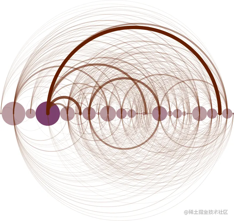 与“弧形图”组合时,将形状区域放置在节点上以提供与其相关的其他变量。Martin Dittus的以下示例 将IRC(Internet中继聊天)通信行为中的数据可视化,以查看谁在与谁讲话,以及谁在给谁命名。在这种可视化中,圆弧代表参考,而圆代表用户,圆的大小与该用户发送的消息数成正比,并且基于平均消息长度来着色。