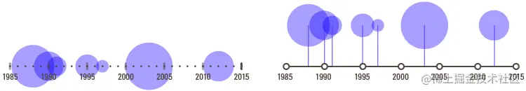 与时间轴结合可以通过两种方式完成。首先(在左侧),将形状区域直接放置在时间线上,形状中心位于与数据关联的日期。其次(在右侧),你可以将形状区域放置在远离时间轴的位置,但是可以使用标注线更清楚地显示形状区域对应的日期。第二个选项还允许通过可能垂直变化的位置来应对由许多形状重叠引起的混乱。