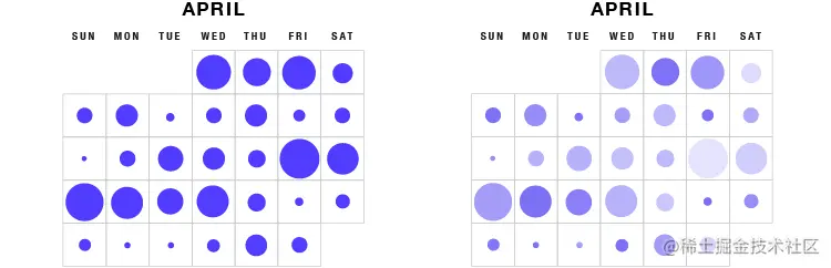 与日历结合使用的方式与与表格结合使用的方式相同。形状区域放置在每个日期单元格内,以可视化特定日期发生的值。在这里,可以查看值在特定月份的变化情况。可以通过按比例改变每个形状区域的阴影或颜色来显示其他变量。