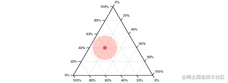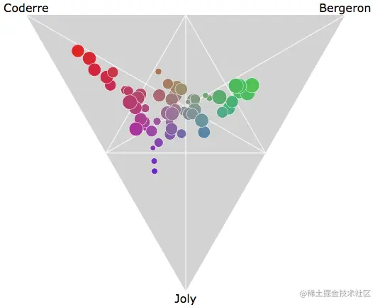 下面的交互式示例甚至使用了可以称为“三元气泡图”的内容。尽管此示例仅显示四个变量(每个政治候选人3个,形状区域的大小由每个地区的投票数决定),但可以将第五个变量分配给颜色阴影(在下面的示例中,颜色仍然是由3个政治候选人变量决定)。阅读更多在这里这个图的结构。