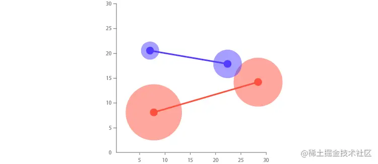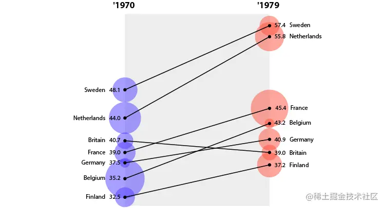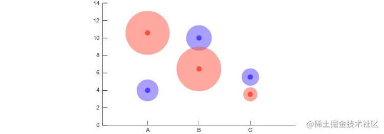 它的功能有点类似于散点图,其中每个轴都是变量,并且绘制了点。但是,使用此图表,可以绘制类别的前/后值,例如在坡度图中,但也可以在每个点上提供附加值,并通过形状区域大小可视化。下面我演示了这一点,其中蓝色是一种类别,红色是另一种类别: