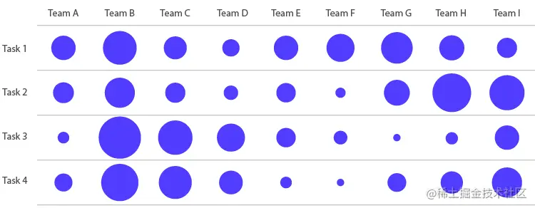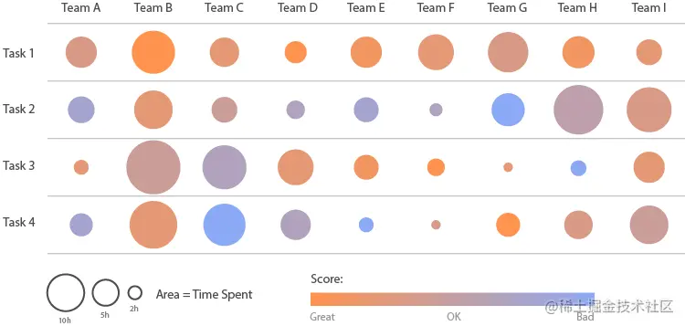 在下面的示例中,圆圈的大小与每个团队在给定任务上花费的时间有关: