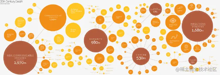 通过更改网络节点的面积大小并使它们与定量值成比例,从而将比例区域图与网络图结合起来。一个很好的例子是信息图表 20世纪,“信息是美丽的死亡”中,人类的不同死亡原因被分类地联系在一起,每个类别或子类别下造成的死亡数量以每个圆圈的面积表示。