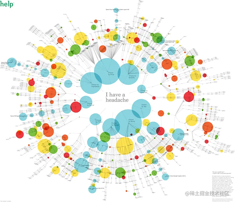 尽管尚不清楚面积的大小或圆圈的颜色代表什么,但此图显示了大量的非处方药,这些药物可用于简单的头痛。从“我头疼”开始,此图指导你完成选择特定品牌时可能要经历的各种决策过程。