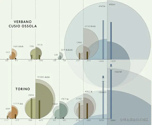 就比如以比例面积图来说,它的结构很简单(形状的面积与其表示的数据值成正比),这使比例面积图易于附加到其他图,这样分析出来的信息能够给我们传递更多的信息,那么我针对比例面积图收集了以下33种不同的组合形式分享给大家: