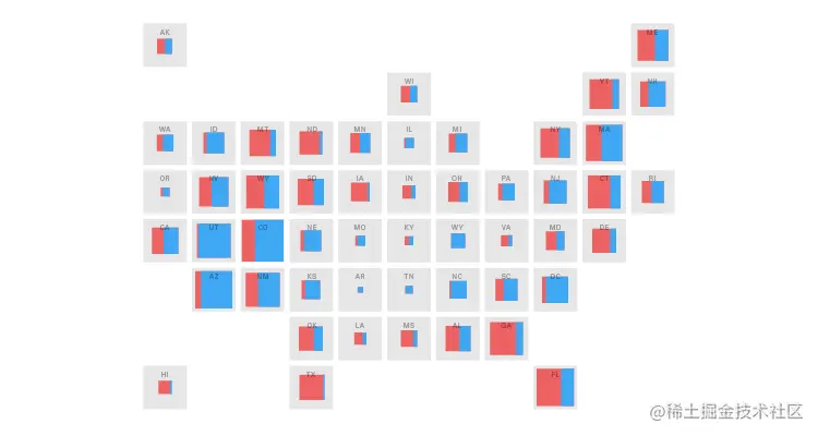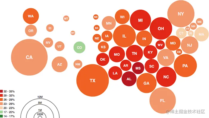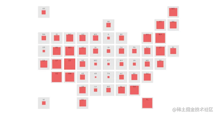 通过与“平铺网格图”结合使用,可以在地理块上显示形状区域。缺少变化的区域大小使得在每个区域进行比较变得容易。以下是一些使用比例面积图的不同变体的示例。