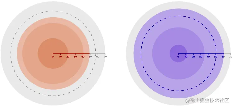 可以制作子弹图的比例区域图版本。在下面,我使用圆的面积来创建“圆形项目符号图”,但是也可以使用正方形来构造此图表。