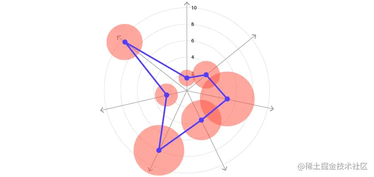 与绘制点的所有图表一样,将形状区域附加到这些点以显示其他变量也很容易。通过与“雷达图”结合使用,那你将获得如下图所示的图表。