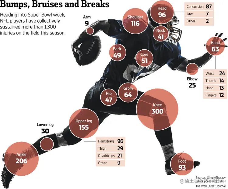 比例区域图可以覆盖在插图或照片上,以提供有关主题的更多信息,从而生成可以显示定量值的插图。在下面的《华尔街日报》的以下示例中,在NFL球员身体的各个部分上显示了圆圈区域,以说明受伤最多的地方。