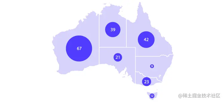 将比例区域图与地图组合会生成气泡图 (如果使用圆形)。在此,圆显示在指定的地理区域内,圆的面积与数据集中的相应值成正比。当然,如果需要,可以用正方形代替圆形,但是圆形看起来会更好。