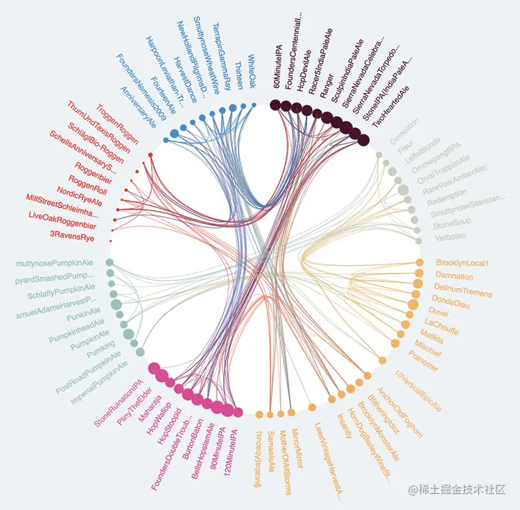 可以通过在连接节点处放置形状区域来与弦图结合。在下面这个名为BeerViz的交互式示例中,用户可以通过连接线查看哪些啤酒彼此相似(基于参数:外观,香气,味道和总体评价)。圆圈的面积代表每种啤酒的受欢迎程度(基于用户评论的数量)。