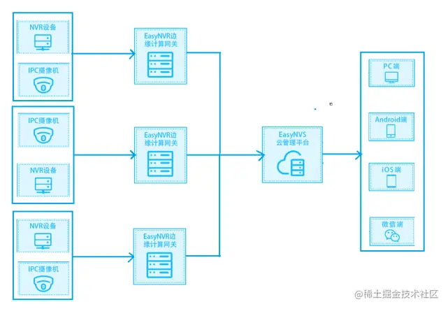 EasyNVR部署在各路段分区中心,下沉到终端网络,置于用户内网现场,对接内网摄像机、NVR网络硬盘录像机等设备;同时主动与云端的EasyNVS云管理平台对接,由EasyNVS进行统一能力输出,主要包括:设备的音视频直播、视频录像、录像检索与回放、用户管理与权限管理、设备管理与关系管理、内网端口穿透输出、云端可视化运维。
