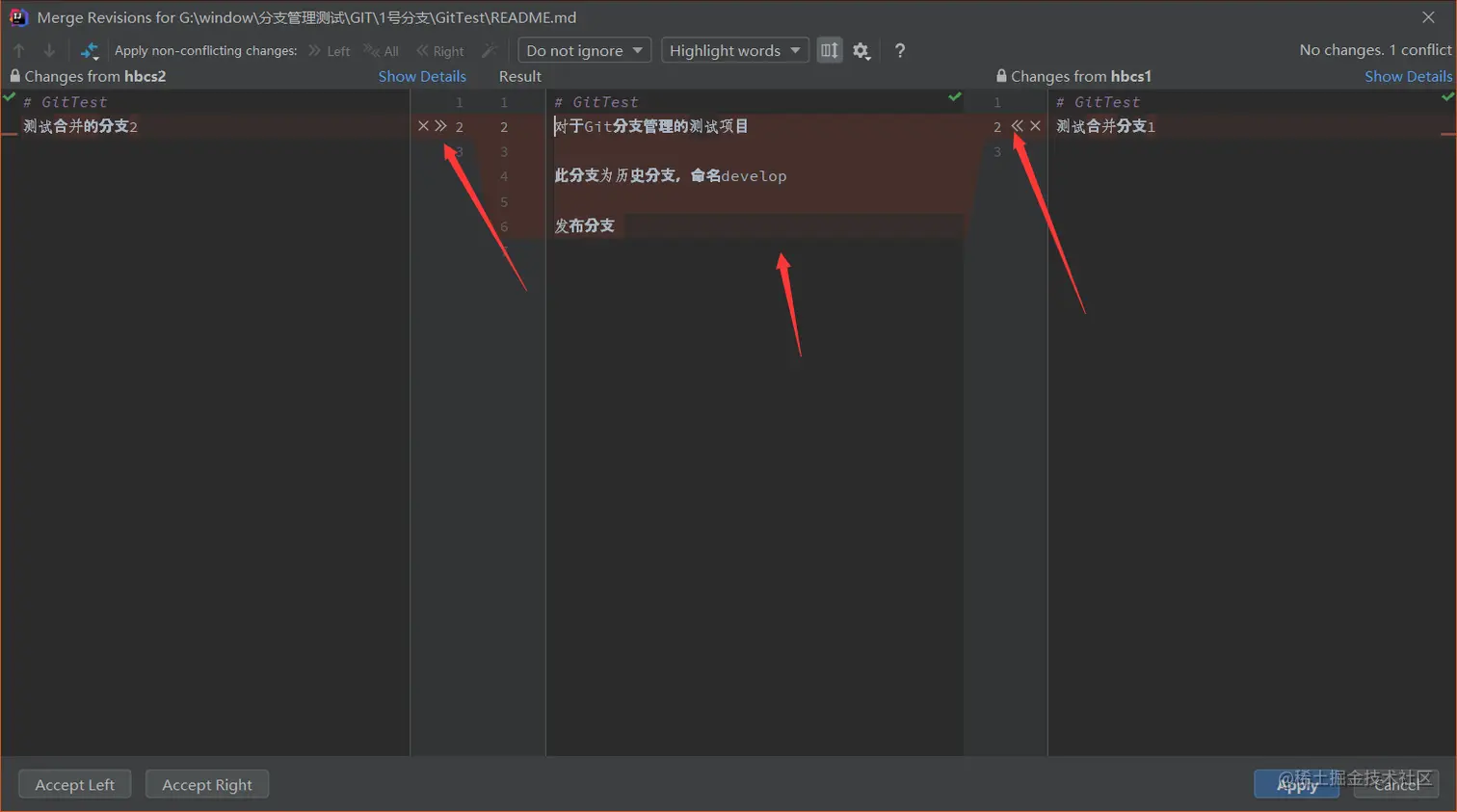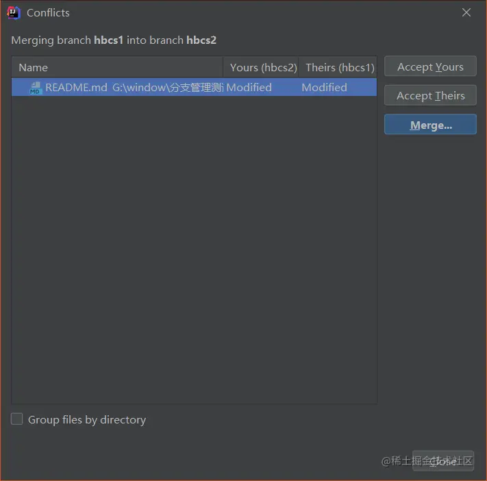 此时会出现分支冲突界面,一般都选择merge(手动解决)
