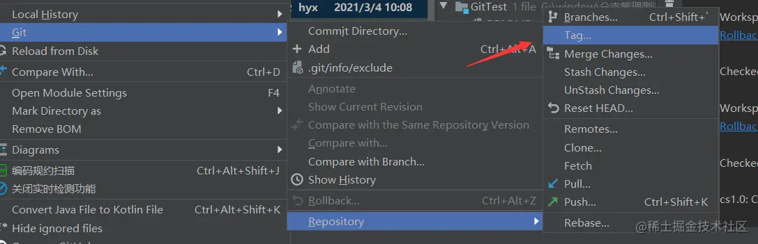 切换到需要打tag的分支,右键点击文件夹,如下图操作