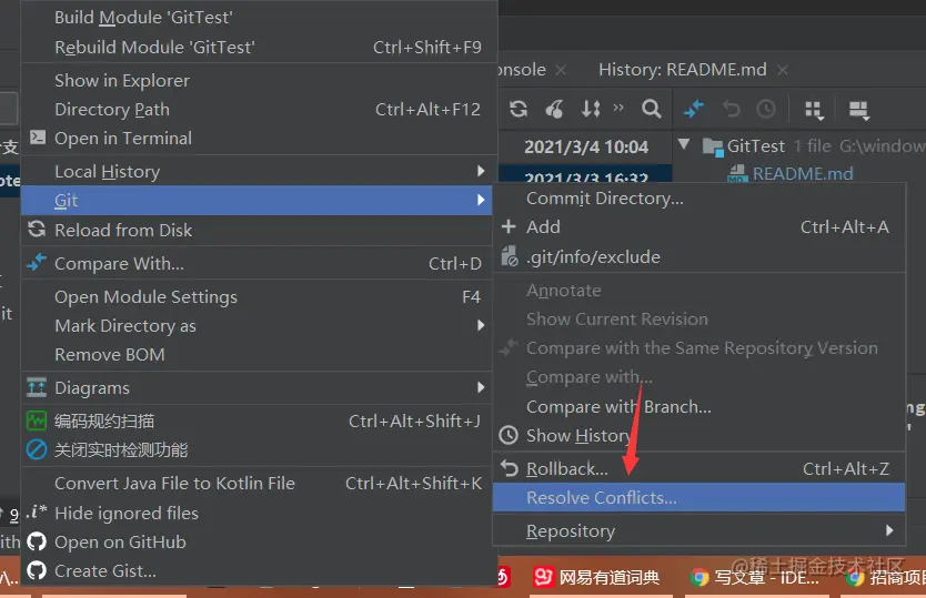 如果没有解决完冲突,关闭冲突页面后,可以右键文件夹选择如图操作,再次打开解决冲突页面