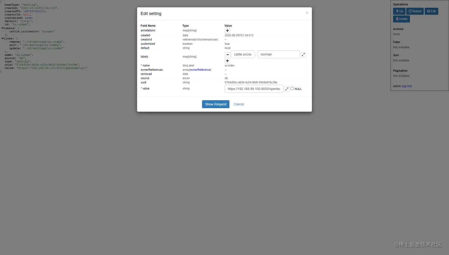 后在rancher中访问 /v3/settings/ui-index 如 我的rancher部署在192.168.59.129