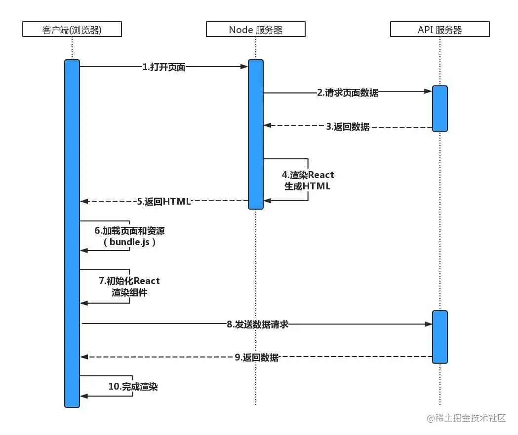 以React为例,首先我们让React代码在服务端执行一次,使得用户下载的HTML已经包含了所有的页面展示内容(达到新增SEO的目的)。同时,用户不需要等到JavaScript代码全部执行完就可以看到页面效果,增强用户体验。之后,我们让React在客户端再次执行,为HTML页面中的内容添加数据及事件的绑定,页面就具备了React的各种交互能力。