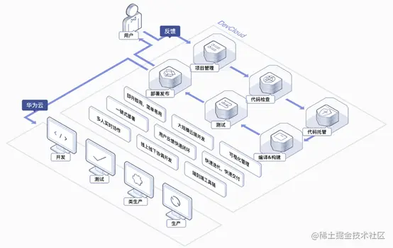 华为云软件开发服务(DevCloud)是一站式云端DevOps平台,面向开发者提供的云服务,即开即用,随时随地在云端进行项目管理、代码托管、代码检查、流水线、编译、构建、部署、测试、发布等,让开发者快速而又轻松地开启云端开发之旅。