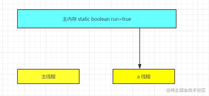 1.初始状态,a线程刚开始从主内存读取了run的值到工作内存。