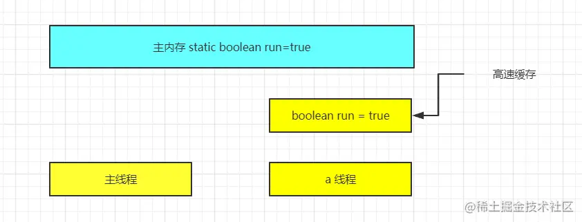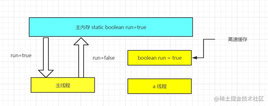 3.1秒之后,main线程修改了run的值,并同步至主存,而a是从自己工作内存中的高速缓存中读取这个变量的值,结果永远是旧值。