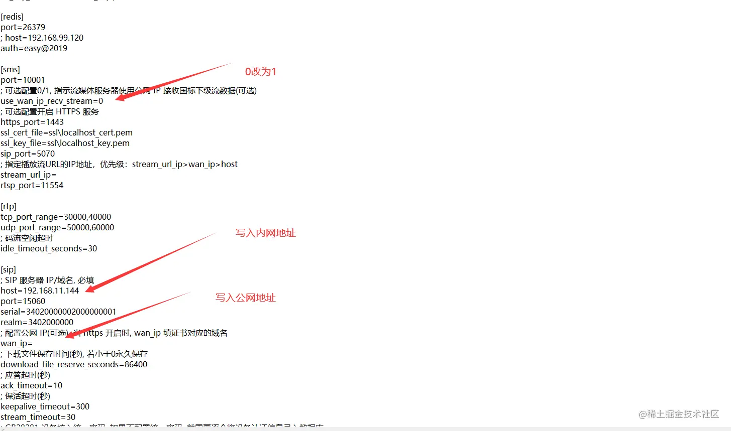 这里我们以公网上配置内网地址为例,首先到easygbs.ini文件里如下图进行修改,总共修改三个地方: