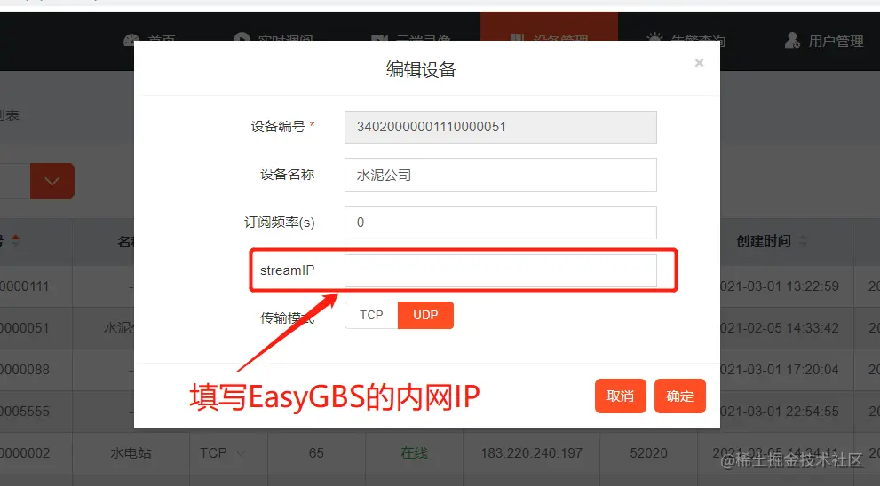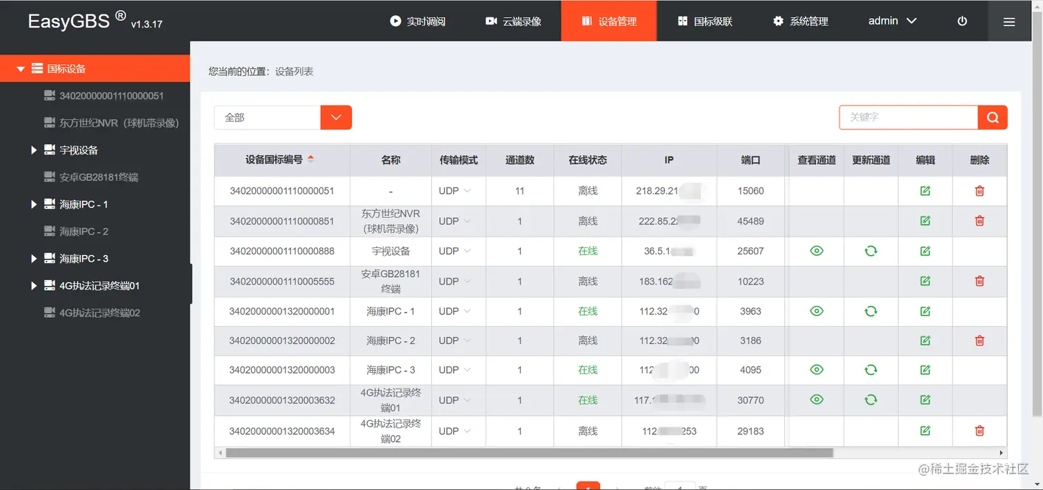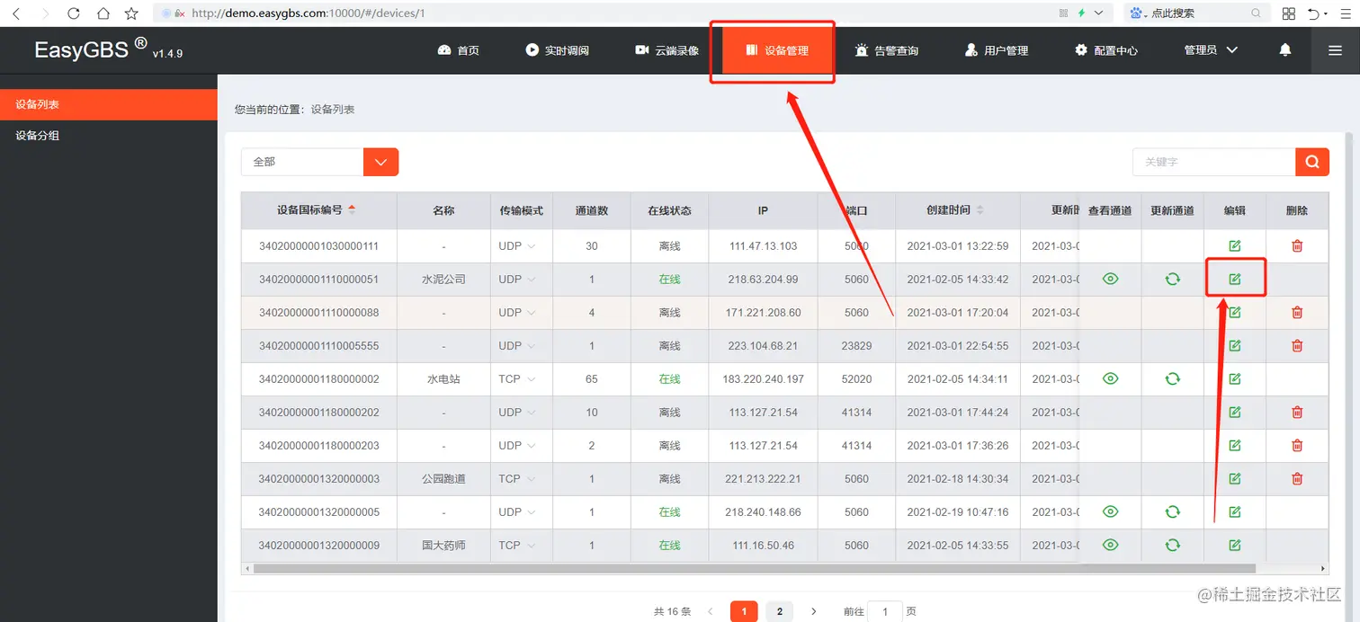 修改完成后启动EasyGBS,进入设备管理,对需要内网播放的通道进行编辑。