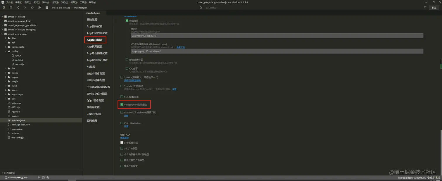 1.打开uni-app下config/app.js修改接口地址,将下图两个地址修改成您的域名