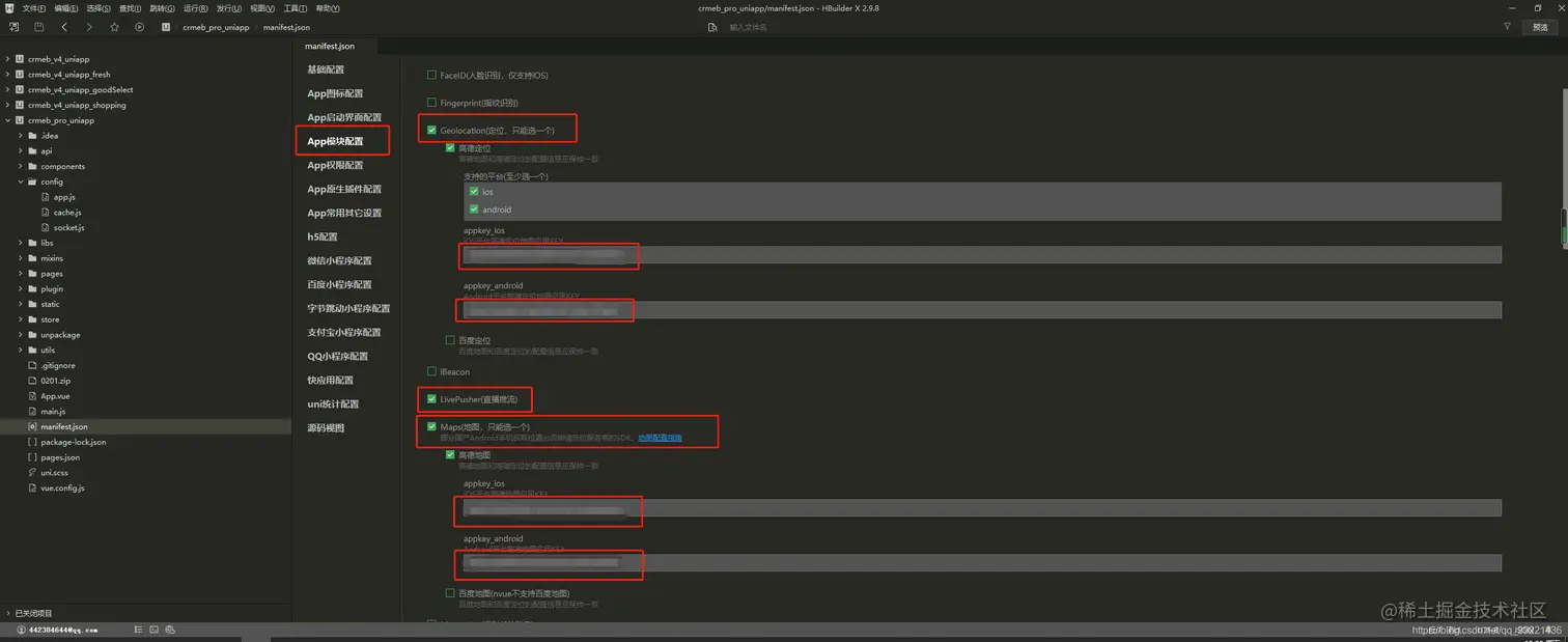 3-1. 选择《Geolocation》,在《高德定位》和《百度定位》中选择一个,填写appkey_ios 和 appkey_android