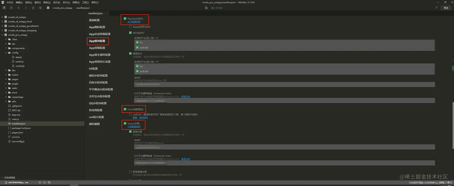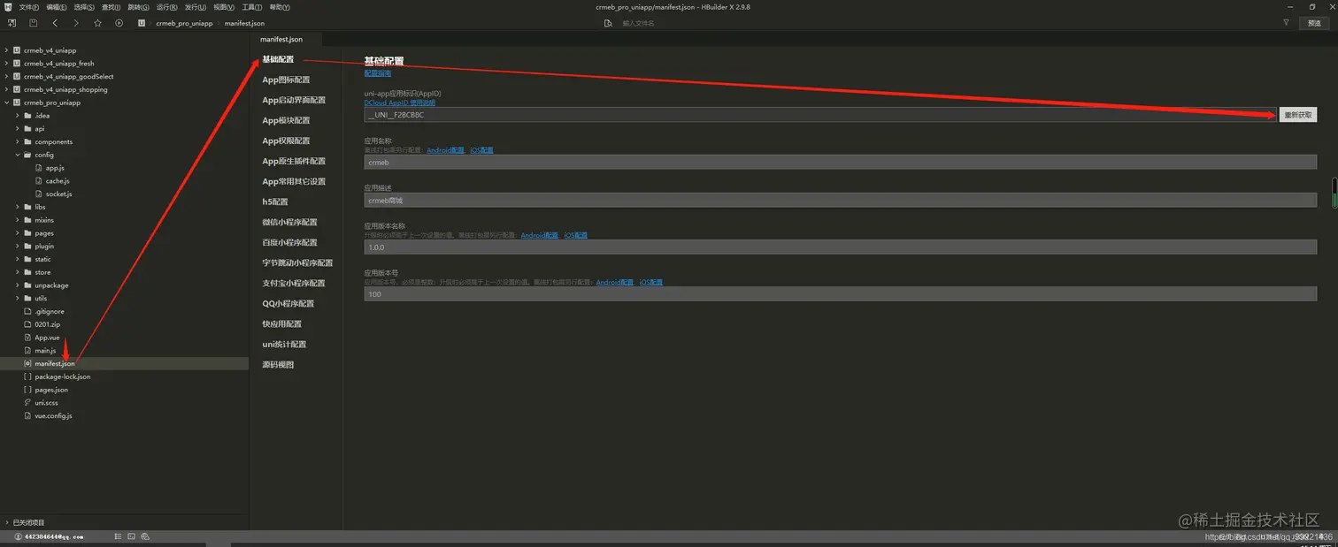 1.打开 uni-app 根目录下的 manifest.json 文件, 点击《基础配置》,重新获取 uni-app应用标识,获取之后填写 应用名称,应用描述,应用版本名称,应用版本号