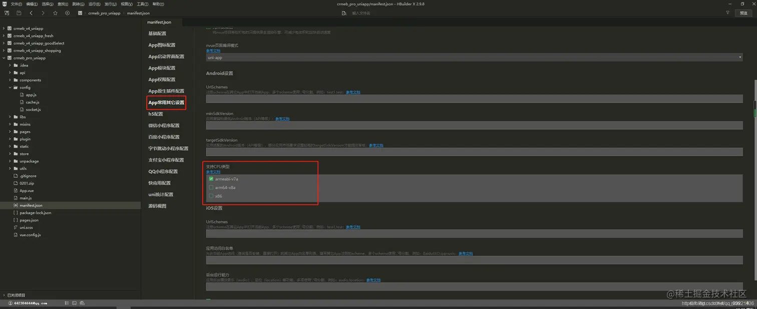 5.点击《App常用其他配置》,勾选《支持CPU类型》下的armeabi-v7a
