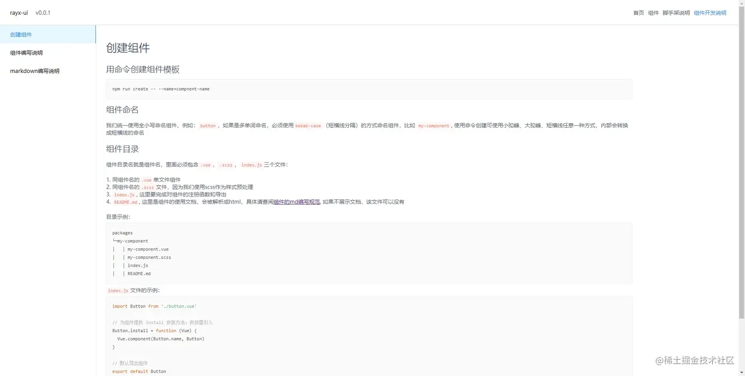 今天要介绍的也是个人开发的一套面向vue的组件库脚手架rayx-ui,开发者只需要按照文档规范开发组件、编写markdown、编写示例,然后执行命令即可生成文档,打包编译。