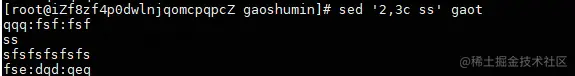 c :取代, c 的后面可以接字串,这些字串可以取代指定的行! 替换多行的时候,除最后一行外,每行末尾需要用"\"代表数据未完结。比如下图是将第二和第三行的数据改为ss。