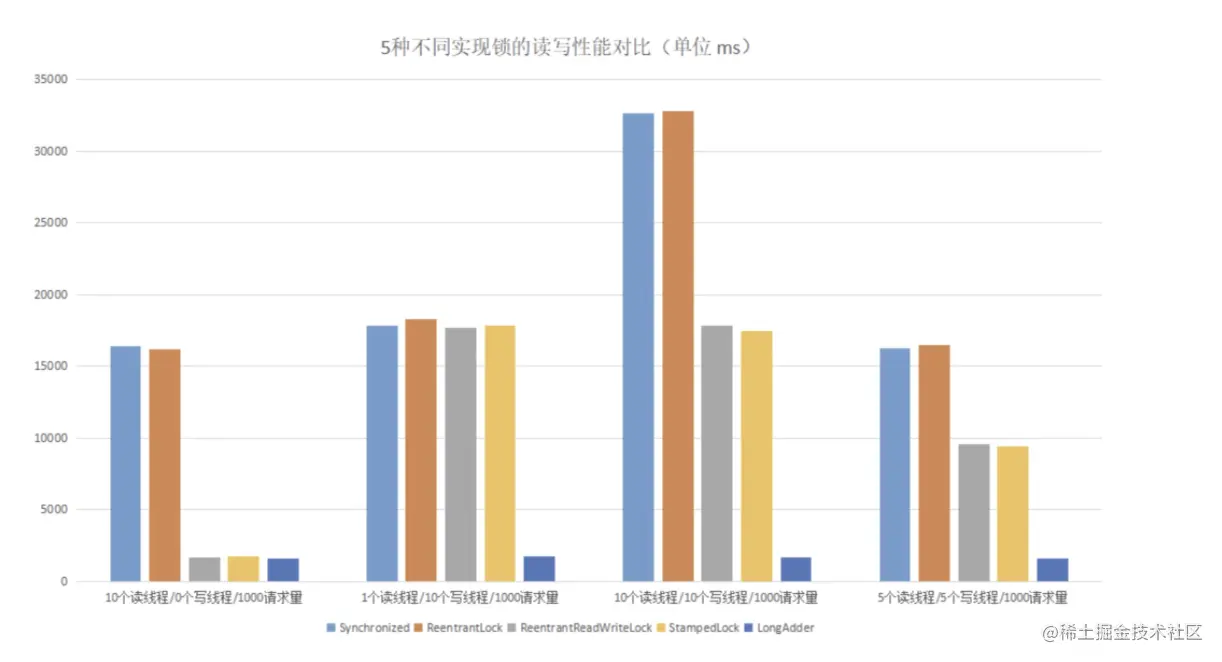 在读大于写的场景下,读写锁 ReentrantReadWriteLock、StampedLock 以及乐观锁的读写性能是最好的;在写大于读的场景下,乐观锁的性能是最好的,其它 4 种锁的性能则相差不多;在读和写差不多的场景下,两种读写锁以及乐观锁的性能要优于 Synchronized 和 ReentrantLock。