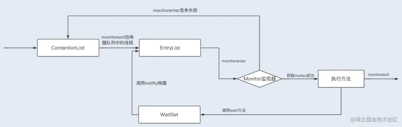 当多个线程同时访问一段同步代码时,多个线程会先被存放在 ContentionList 和 _EntryList 集合中,处于 block 状态的线程,都会被加入到该列表(在获取到参与锁资源竞争的线程会进入entrylist,线程monitorenter失败后会进入到waitset,此时说明已经有线程获取到锁了,所以需要进入等待。调用wait方法也会进入到waitset)。接下来当线程获取到对象的 Monitor 时,Monitor 是依靠底层操作系统的 Mutex Lock 来实现互斥的,线程申请 Mutex 成功,则持有该 Mutex,其它线程将无法获取到该 Mutex,竞争失败的线程会再次进入 ContentionList 被挂起。