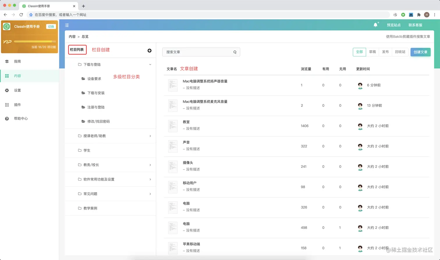 进入操作台就可以添加帮助中心对外展示的内容了,内容由栏目和文章组成,创建的文章需要放到栏目中进行分类展示。支持三级以上的栏目分类。