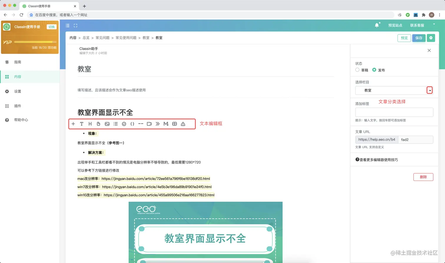 进入内容界面,编辑器上支持富文本和Markdown编辑器,基础功能完善支持图片、视频、文件...完成文章编辑后,将发布状态调整为“发布”,文章对外展示的url可以自由调整,方便管理。点击右侧的“保存”按钮即可保存成功。